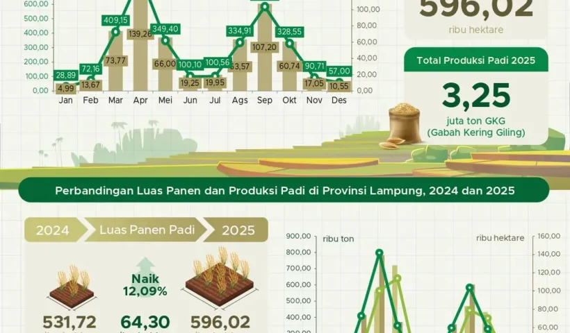 NOMICS.ID – Produksi padi Provinsi Lampung sepanjang 2025 menunjukkan peningkatan signifikan dibandingkan tahun sebelumnya. Berdasarkan data resmi Badan Pusat Statistik (BPS) Provinsi Lampung, luas panen…