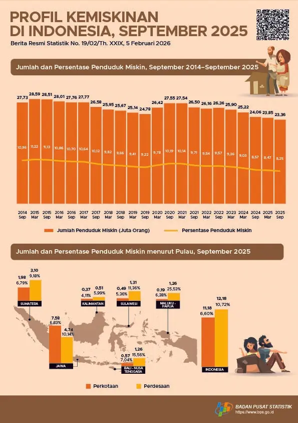 NOMICS – Badan Pusat Statistik (BPS) melaporkan bahwa tingkat kemiskinan Indonesia pada September 2025 kembali turun, namun penurunannya menunjukkan pola yang tidak merata antara kota dan desa serta antarwilayah. Berdasarkan Berita Resmi Statistik (BRS) No. 19/02/Th. XXIX yang dirilis 5 Februari 2026, persentase penduduk miskin nasional tercatat sebesar 8,25 persen, turun 0,22 poin dibanding Maret 2025 dan 0,32 poin dibanding September 2024.