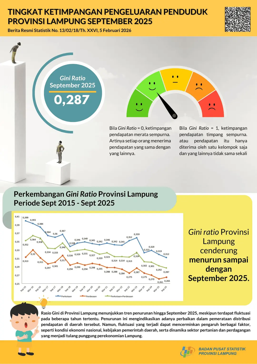 Jika dibandingkan dengan September 2024 yang mencapai 0,301, penurunan 0,014 poin ini menunjukkan tren perbaikan jangka panjang dalam distribusi ekonomi masyarakat Lampung. Penurunan ini juga terlihat dibandingkan Maret 2025, dari 0,292 menjadi 0,287.