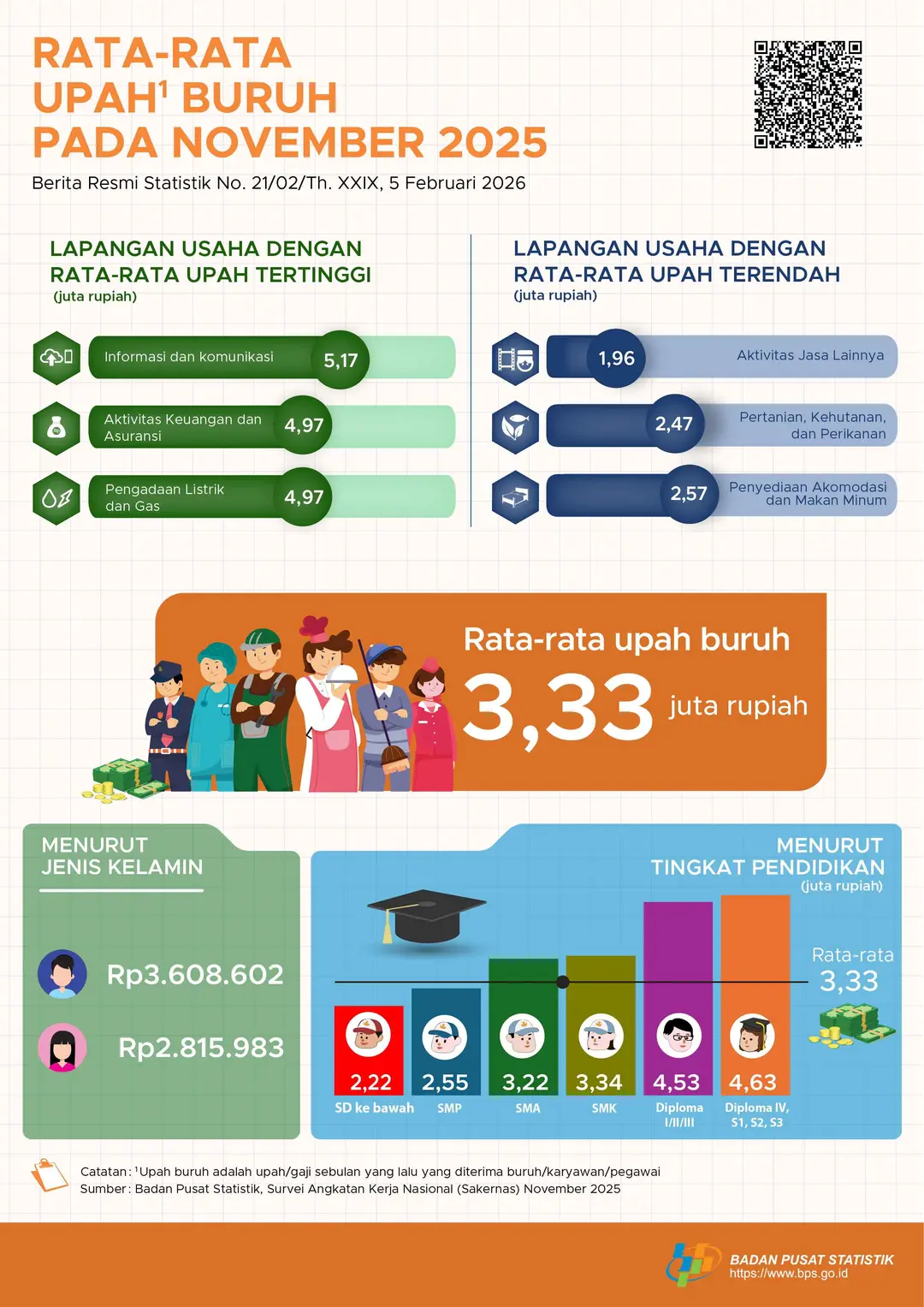 Rata-rata upah buruh nasional tercatat Rp3,33 juta, menunjukkan peningkatan nominal tetapi belum merata seiring dengan dominasi pekerjaan informal dan setengah pengangguran yang masih mencapai 7,81 persen. Ketimpangan ini memperlihatkan bahwa meski pengangguran menurun, tantangan utama pasar kerja Indonesia tetap pada tingginya pengangguran pemuda, dominasi pekerjaan informal, dan rendahnya kualitas tenaga kerja menengah. Ketimpangan antara perkotaan dan perdesaan serta kesenjangan upah semakin menegaskan perlunya kebijakan yang lebih fokus pada peningkatan keterampilan dan produktivitas pekerja.(IWA)