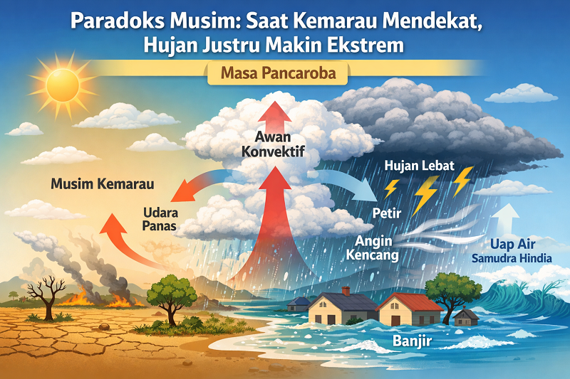 Dalam ilmu klimatologi, fenomena tersebut sebenarnya bukan hal yang aneh. Justru pada masa peralihan dari musim hujan menuju musim kemarau yang biasanya berlangsung sekitar Maret hingga April, atmosfer berada dalam kondisi paling tidak stabil. Periode ini dikenal sebagai masa pancaroba, saat dua karakter musim yang berbeda saling bertemu dalam satu sistem cuaca yang sama. Periode ini, seringkali kurang menjadi perhatian pemerintah sehingga terkaget-kaget ketika banjir datang.