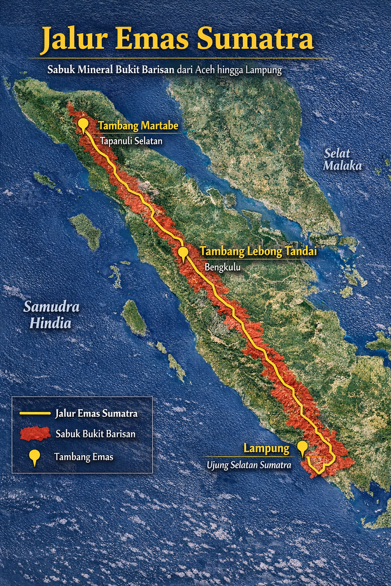 Dalam kajian Geologi, jalur emas Sumatra terbentuk dari proses tektonik panjang akibat pertemuan Lempeng Indo-Australia dan Eurasia. Tumbukan kedua lempeng ini selama jutaan tahun menciptakan rangkaian gunung api, sistem hidrotermal, serta patahan besar yang menjadi tempat terbentuknya berbagai mineral logam, termasuk emas.