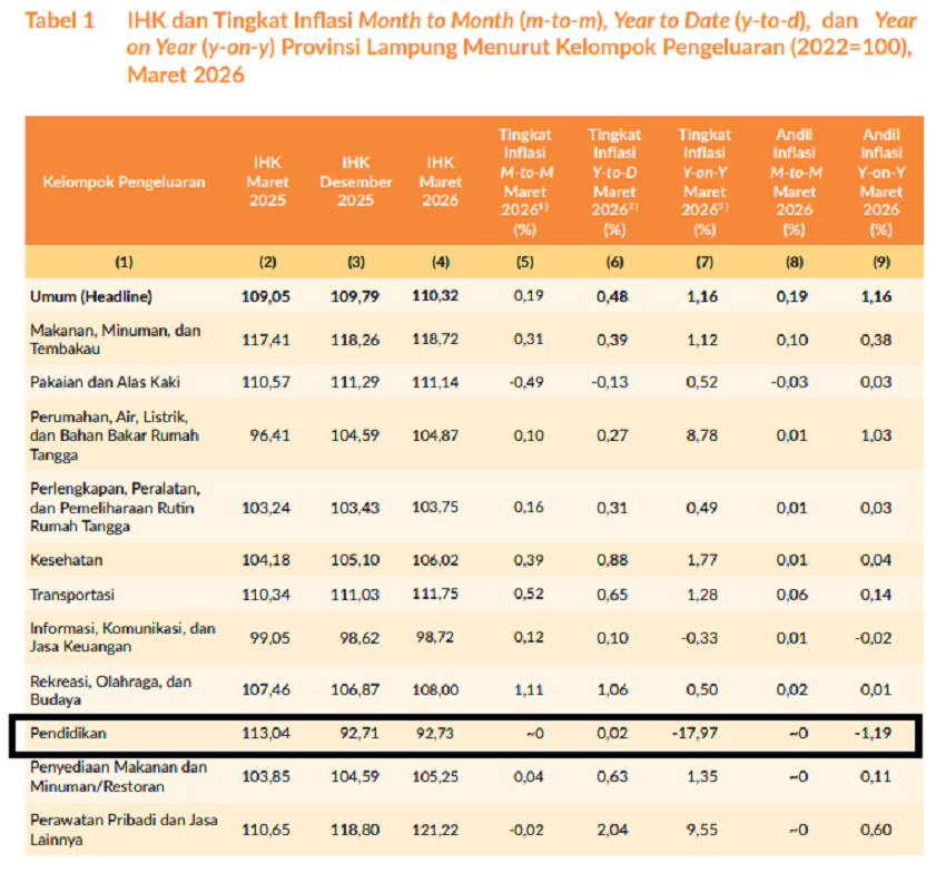 Di balik inflasi Lampung yang hanya 1,16 persen secara tahunan pada Maret 2026, tersimpan satu anomali besar yaitu deflasi sektor pendidikan hingga minus 17,97 persen. Angka ini bukan sekadar penurunan biasa, melainkan faktor dominan yang menahan laju inflasi dan membentuk persepsi stabilitas ekonomi.