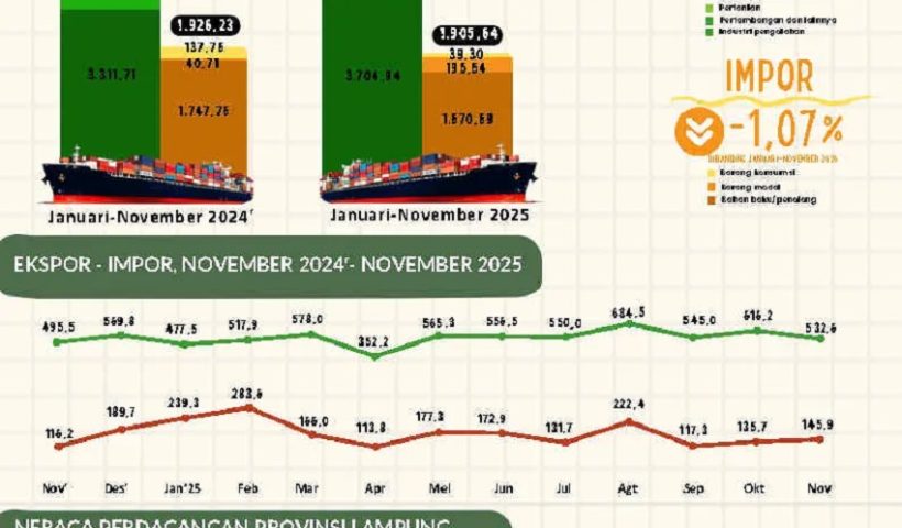 LAMPUNG – Provinsi Lampung menutup November 2025 dengan kinerja ekspor yang menunjukkan tren positif. Badan Pusat Statistik (BPS) Lampung mencatat nilai ekspor provinsi ini mencapai US$532,61…